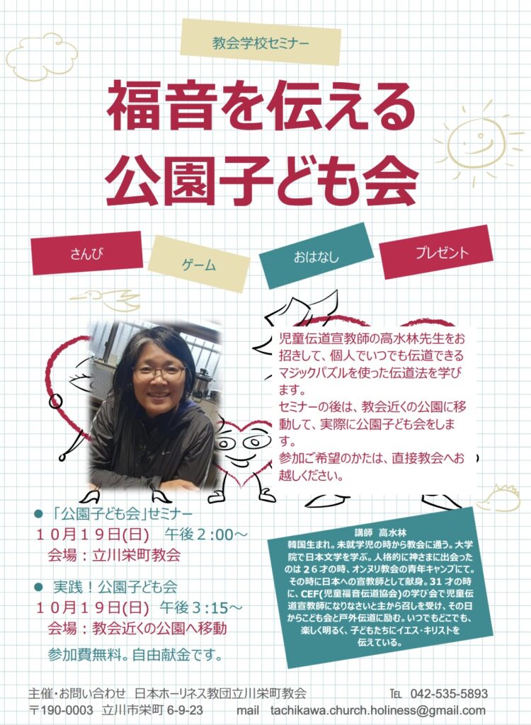 「公園子ども会」せミナー 10月19日(日) 午後2:00~3:00 立川栄町教会